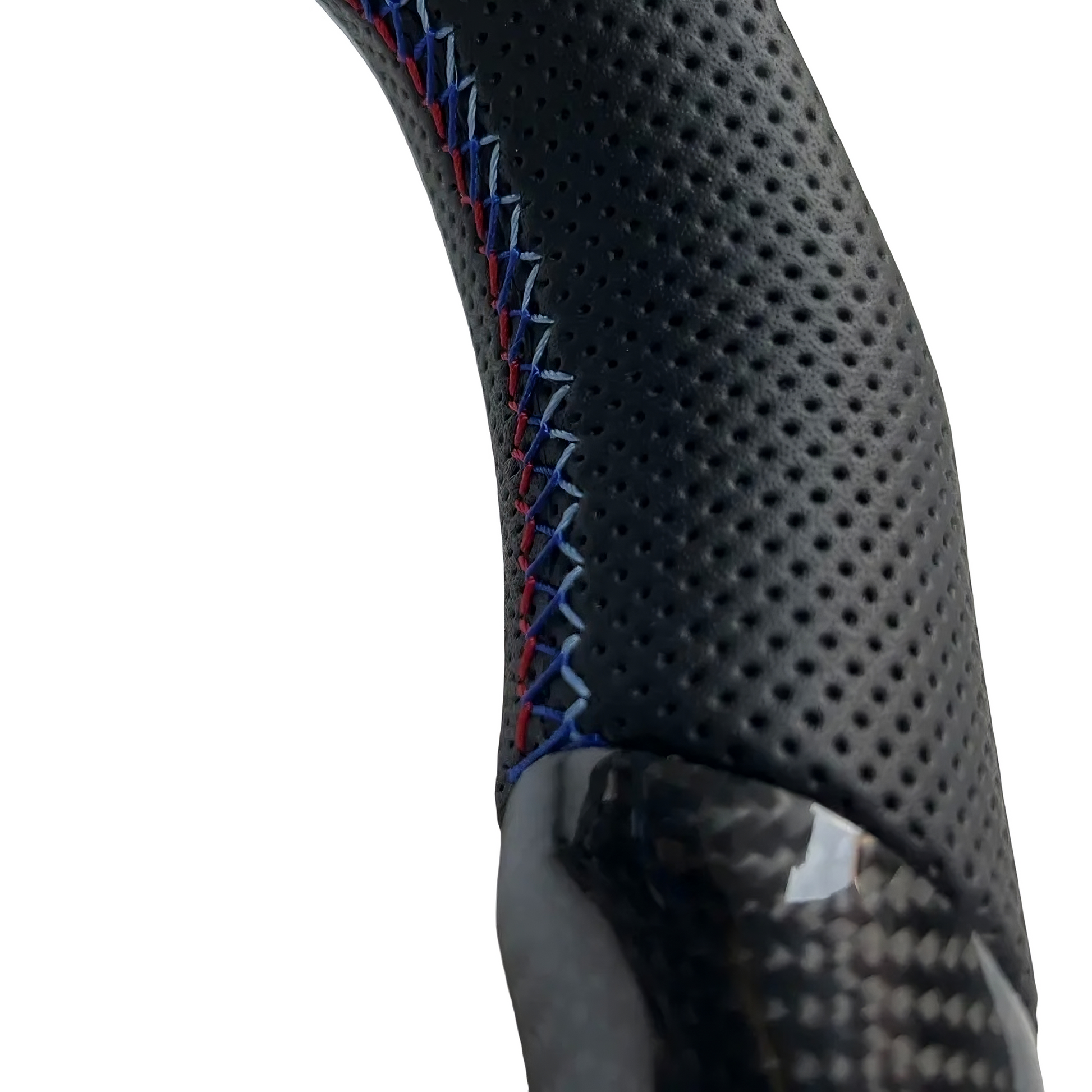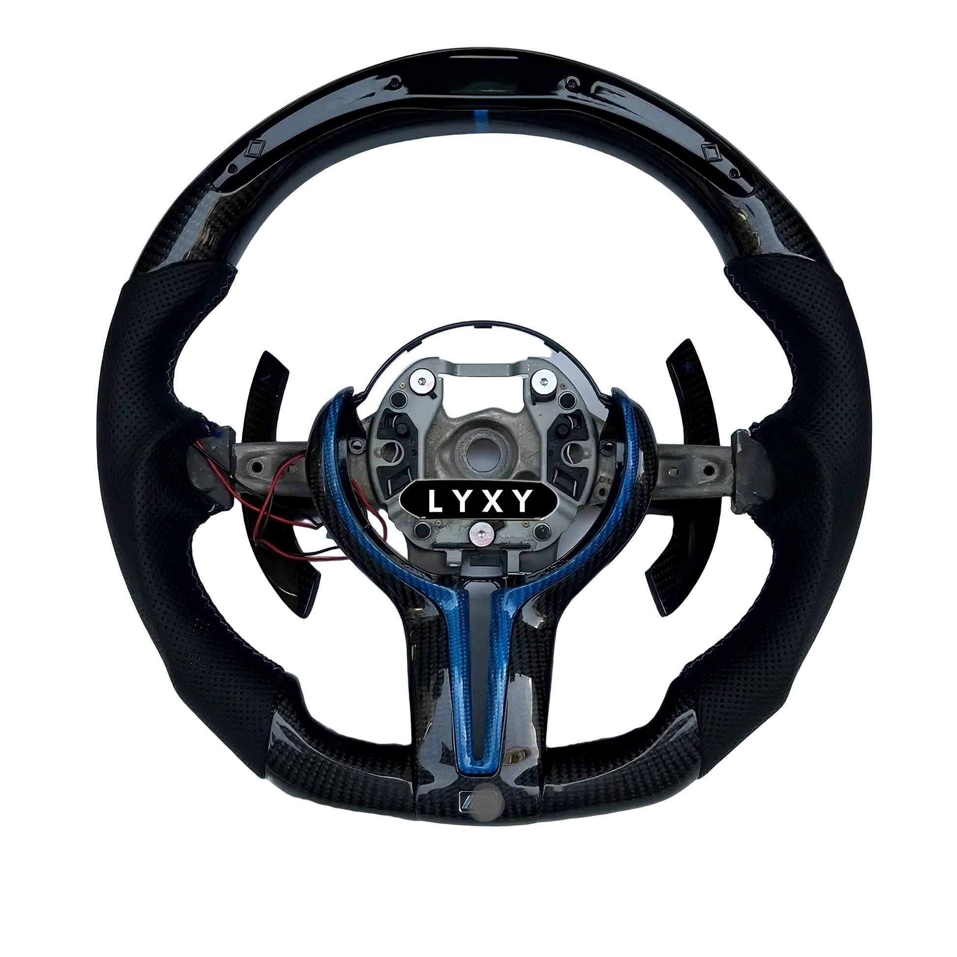 BMW sport ratt med LED display och kolfiber. Kombinerad med blåa detaljer såsom stygn och blått kolfiber.